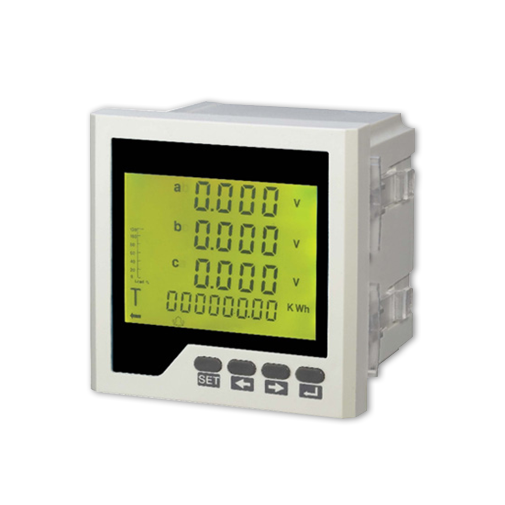 三相多功能电量仪 用于检测机房供电的三相电参数(比如各相电压、电流、功率、频率等参数),每个仪表的大小为96*96*96mm, 一般放置在电箱里。一般将机房供电的三相三线或者三相四线连接到仪表的前面接头,仪表输出信号为RS485数据通讯(二芯,双绞线连接至RS485总线上)。